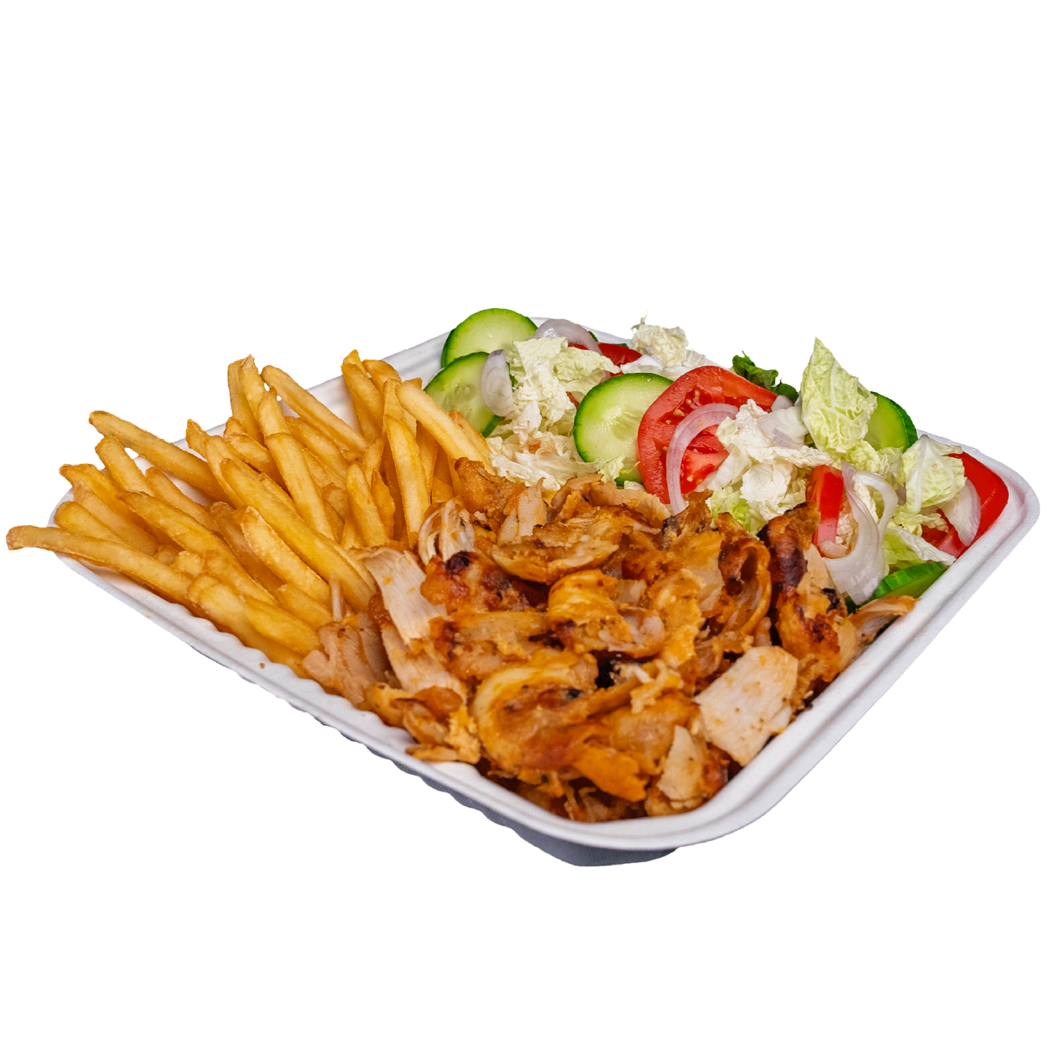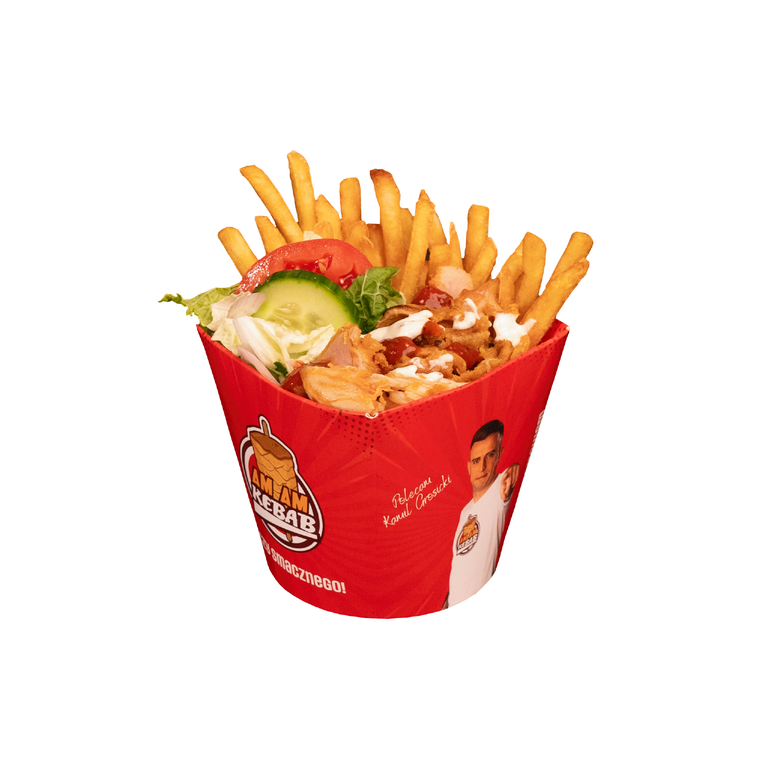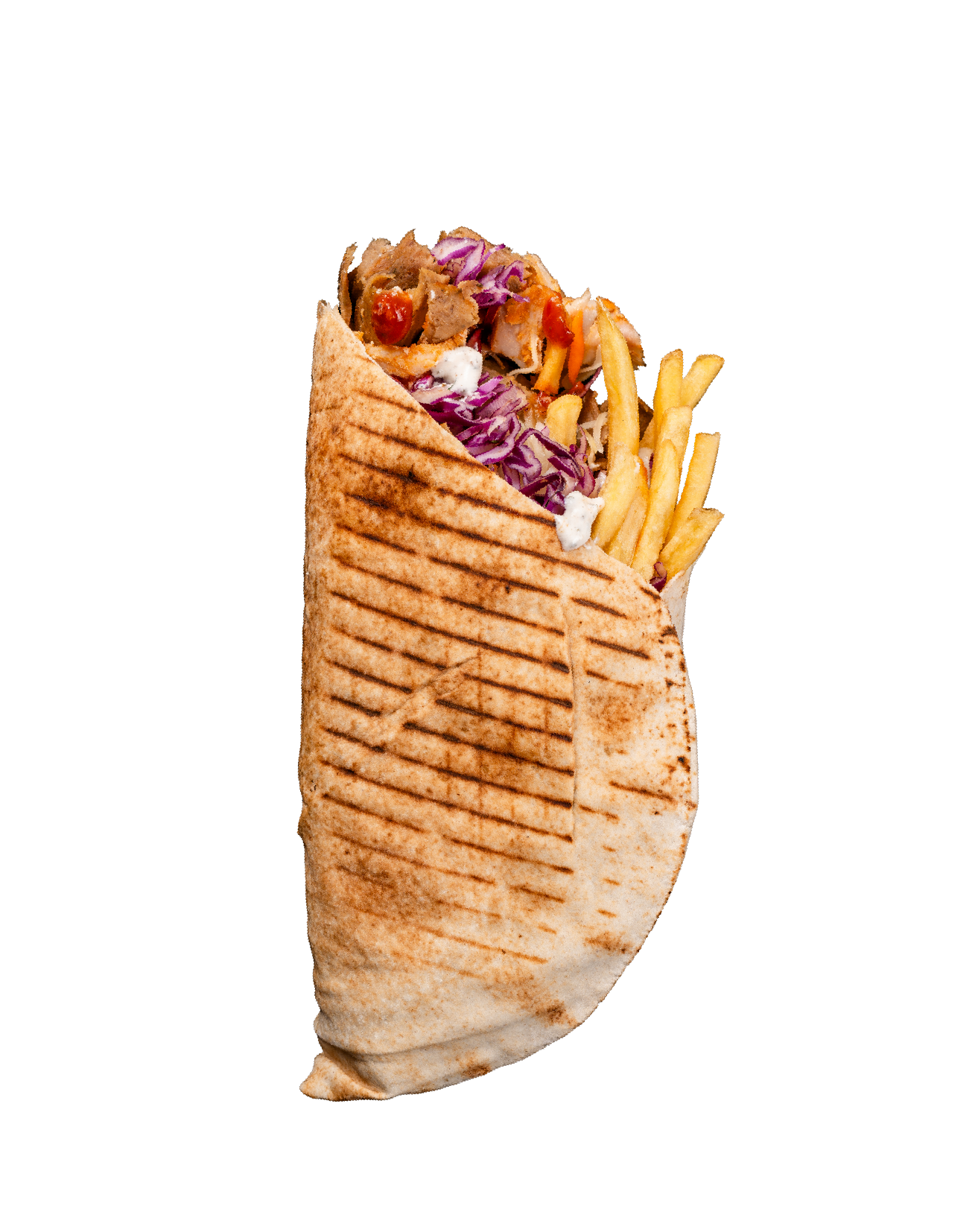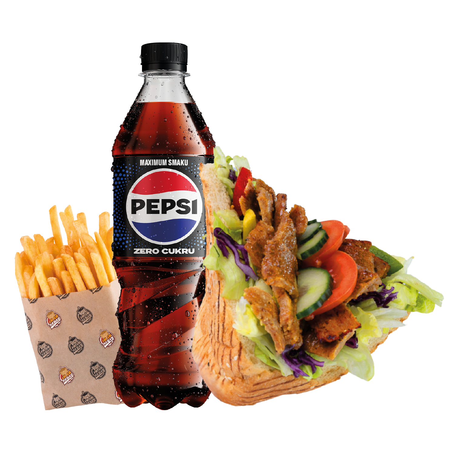 pita 65 g + mięso 130 g + frytki 70 g + warzywa + surówki + sos